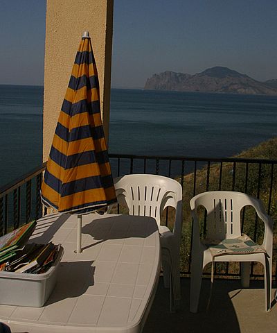 Одна двухместная большая комната на втором этаже с туалетом и ванной комнатой, с кондиционером и большим балконом-верандой. Лучшая панорама на посёлок Орджоникидзе, пляж, Кара-Даг и открытое море. Стоимость проживания: 30 у. е. с человека в сутки.